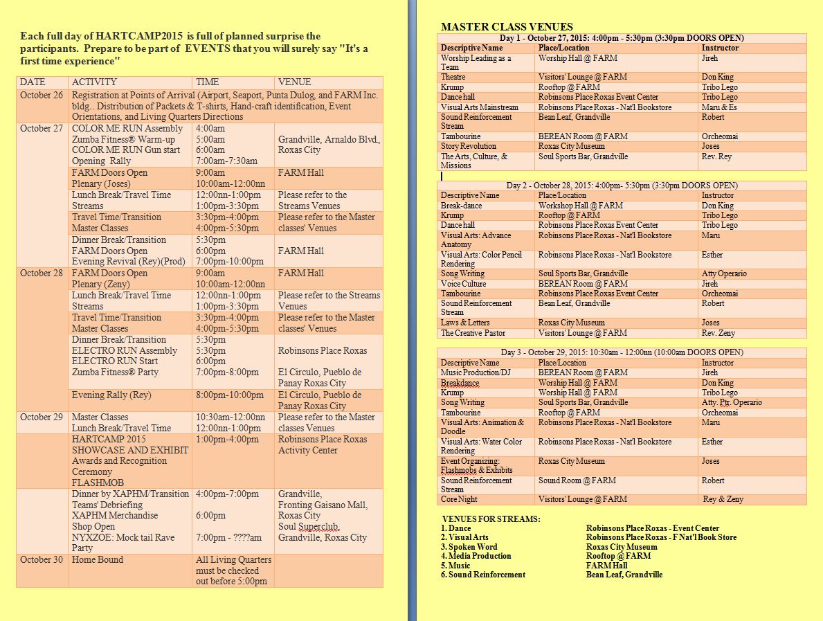 From registration on October 26 and through the 3-full days of the HART CAMP 2015, participants are in for many surprises. Major features include: Plenary Sessions, Culture Streams, Master Classes, Rallies and Events to remember.